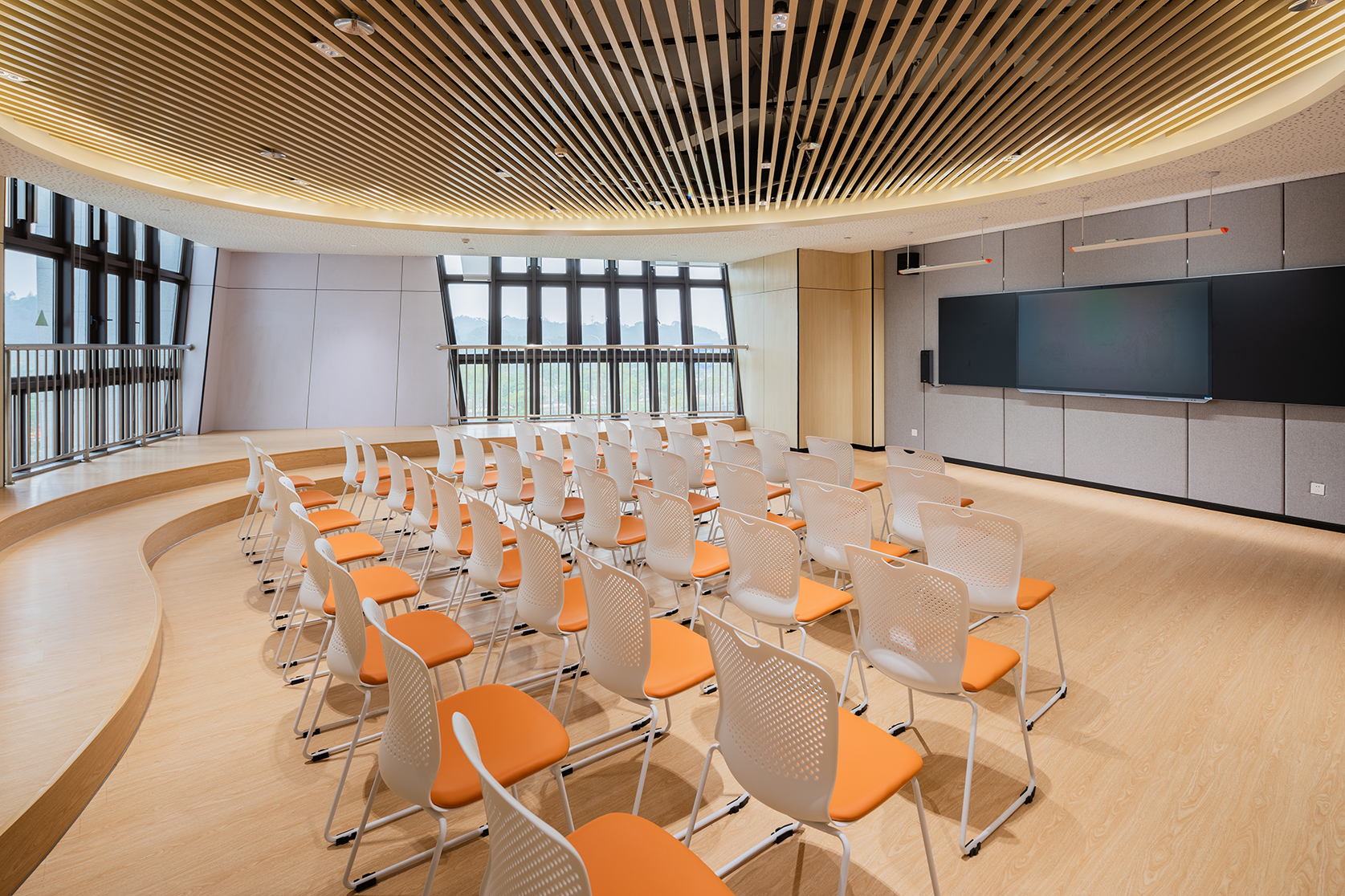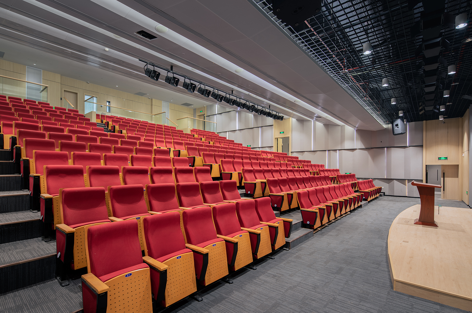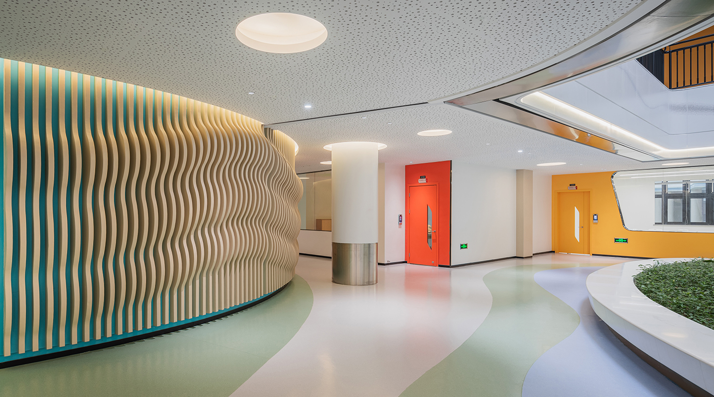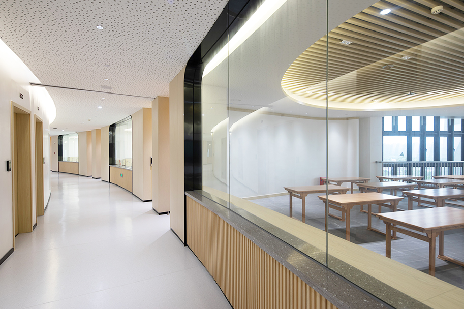 校園環(huán)境關(guān)乎著(zhù)每一位孩子的身心健康,因此,學(xué)校建設更應嚴格強調工程質(zhì)量的安全環(huán)保。對于這一方面,港源裝飾與甲方的意見(jiàn)高度統一,因此仿木紋金屬墻面便成為亮亮中學(xué)室內環(huán)境的重要材質(zhì)。仿木紋金屬墻面不僅有極佳的質(zhì)感,而且具備環(huán)保、防潮、抗菌等優(yōu)勢,但金屬材質(zhì)易變形的屬性也同時(shí)存在。為了堅持環(huán)保優(yōu)先原則,港源裝飾團隊反復論證,決定增加輕鋼龍骨等基層處理工序來(lái)保障金屬墻面的平整度及垂直度,并且達到了易于拆裝、降低維護成本的目的。
